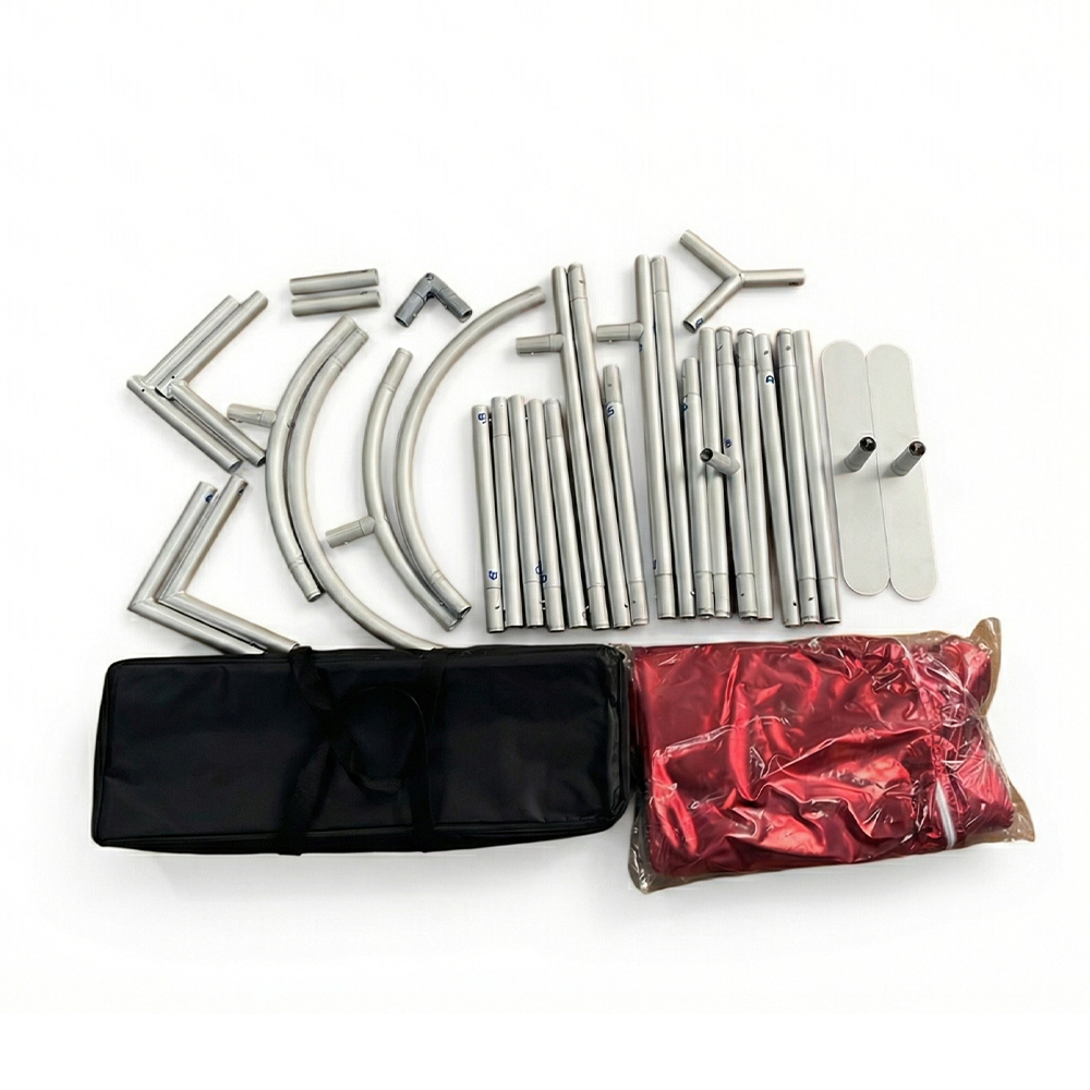 El soporte de arco está fabricado en aleación de aluminio, un proceso de fabricación perfecto que le confiere un aspecto lujoso y a la vez muy resistente. Se monta y desmonta rápidamente y es reutilizable. Utilizamos tubos de aleación de aluminio de 1,1 mm de grosor y 32 mm de diámetro.