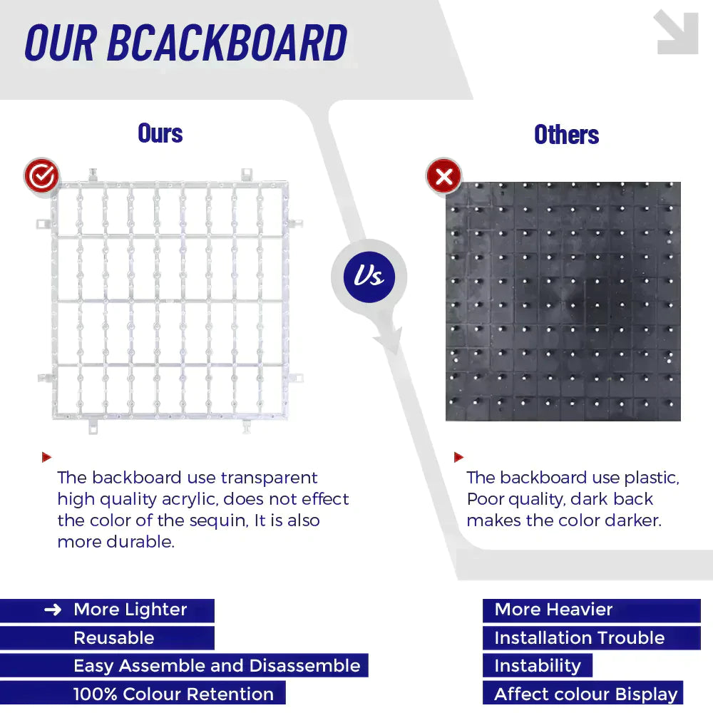 The backboard of our sequins is made of transparent acrylic material, which is strong and durable. There are buckles between each backboard, to facilitate the connection the backboard.